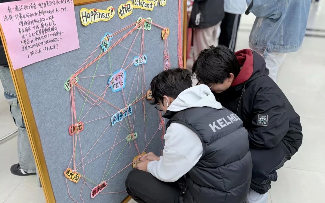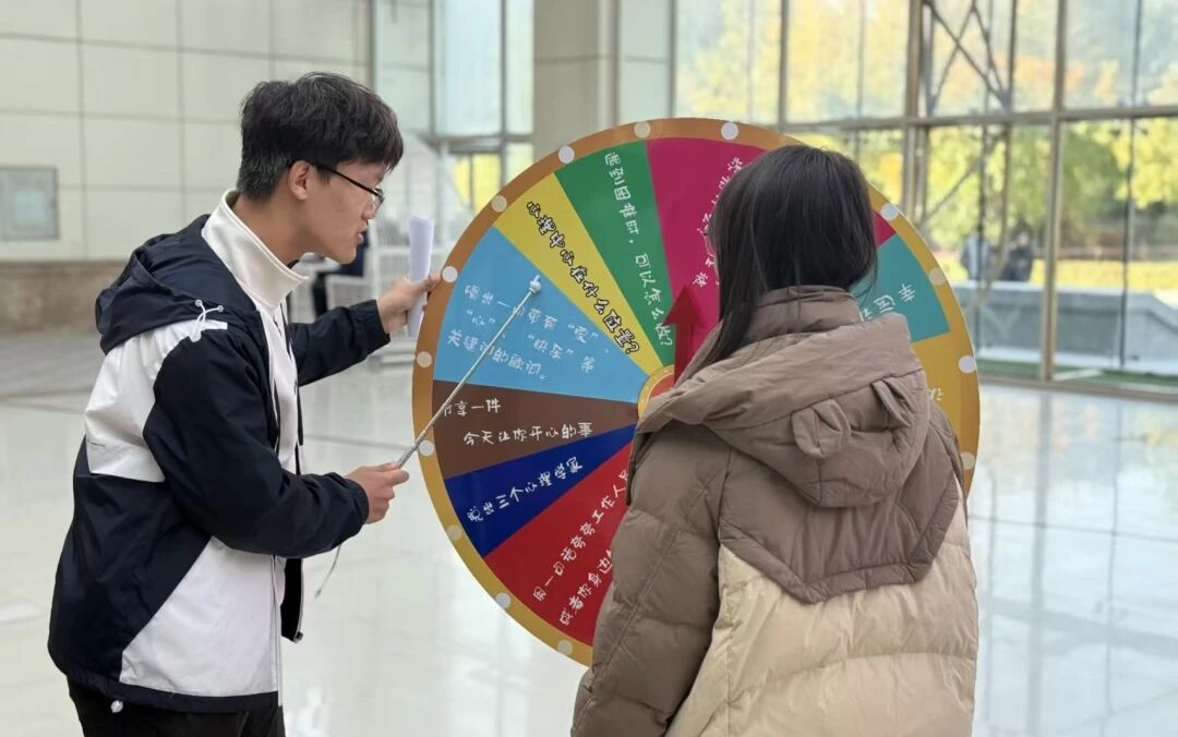除外国语学院的特色活动外,其他学院也围绕心理健康主题,带来了形式多样的体验项目。“幸运心理转盘”通过趣味问答与随机奖励,让学生在轻松互动中学习心理健康知识;“创意扭扭棒手工”鼓励学生用彩色扭扭棒塑造专属造型,将内心情绪转化为具象作品,实现情绪的可视化表达;“‘撕’去负面标签”活动让学生写下自我否定的标签并当场撕掉,帮助大家摆脱心理枷锁,重塑积极自我认知;“心灵装饰画创作”与“折纸艺术体验”,以画笔和纸张为载体,让学生在创作中沉淀思绪、舒缓压力;“温暖毛线编织”则通过重复的编织动作,带来类似冥想的放松效果,帮助学生平复焦虑,在一针一线中感受专注与平静。