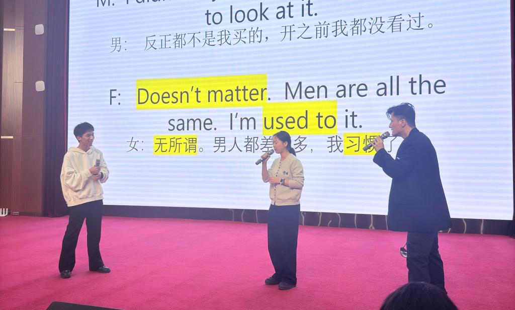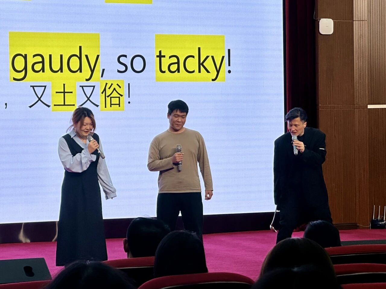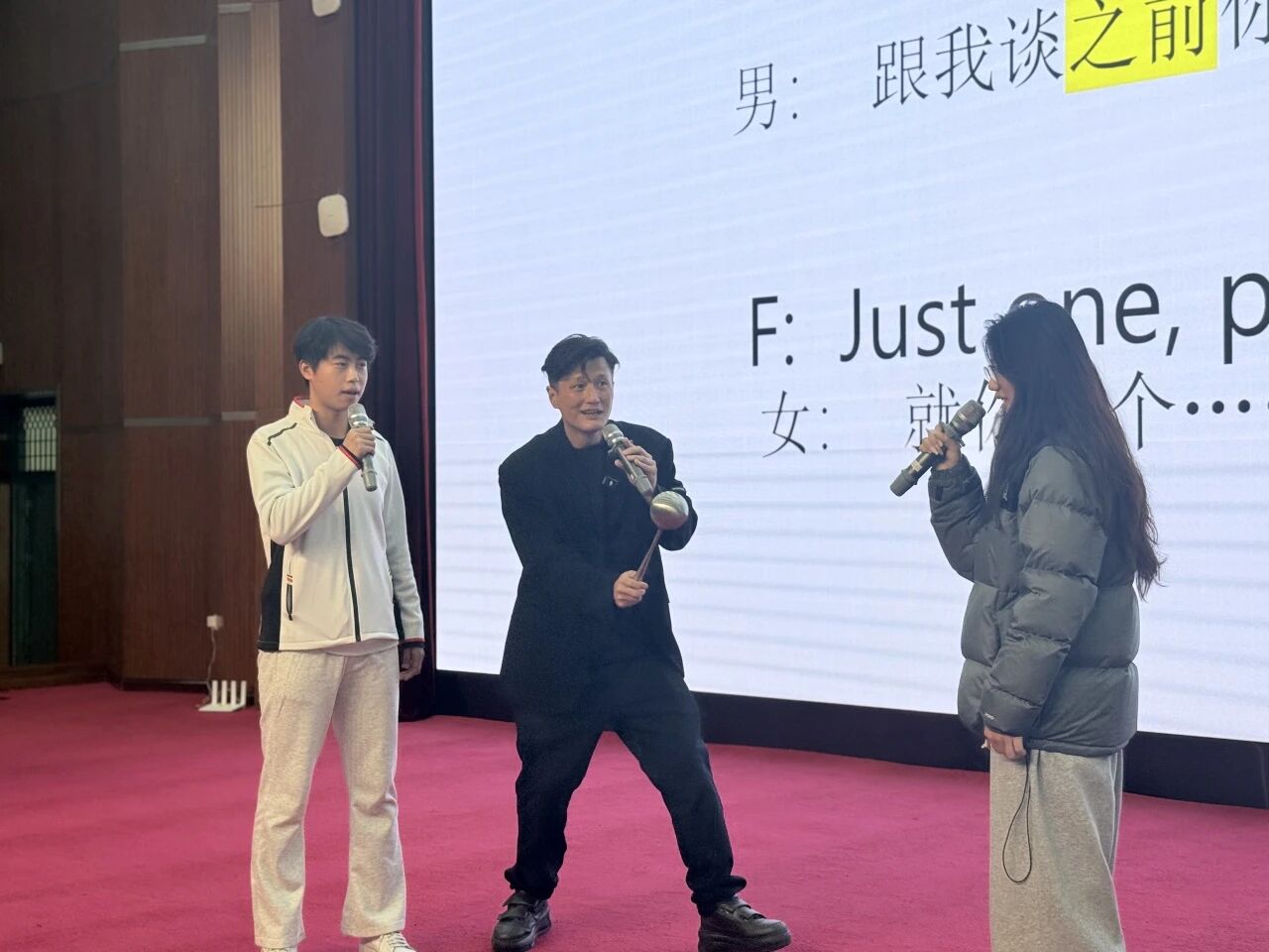 在互动环节,尹子维邀请几位同学上台,通过截取电视剧情节的方式,现场进行英语对话教学。他一边表演,一边逐句翻译,耐心纠正同学们的发音和语调,让大家在沉浸式的情境中感受英语的魅力。外国语学院学子们积极参与,课堂气氛热烈,笑声不断。