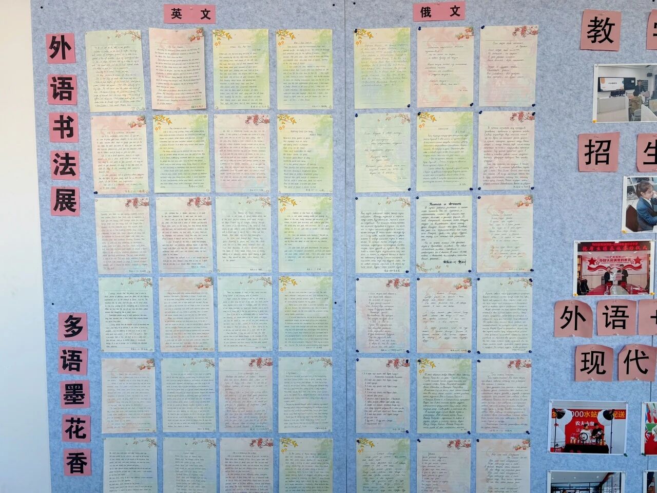为夯实学生外文书写基础,以文化活动助力学风建设,搭建师生交流学习平台,近日,外国语学院举办中外文书法展,全院师生积极参与。