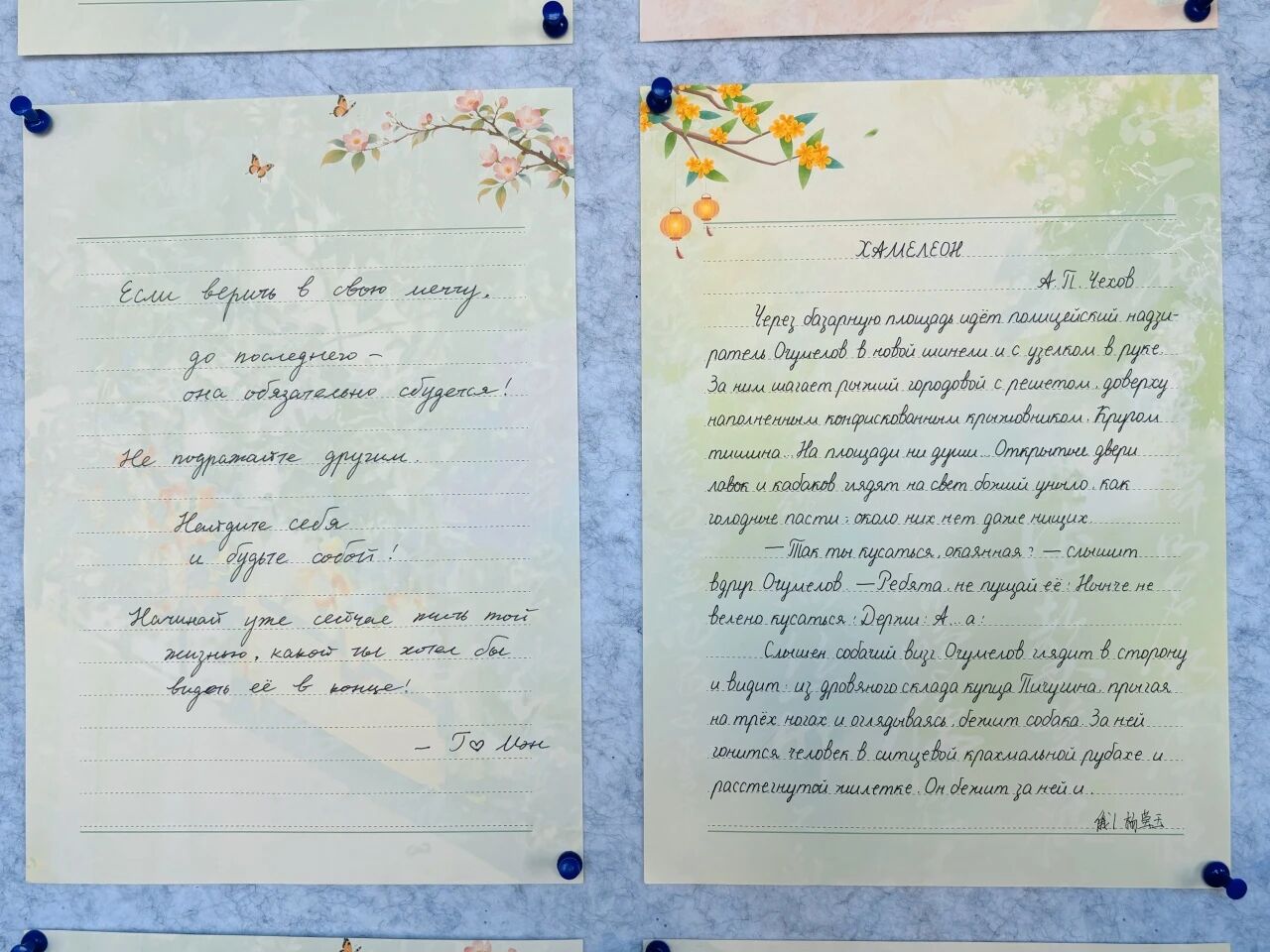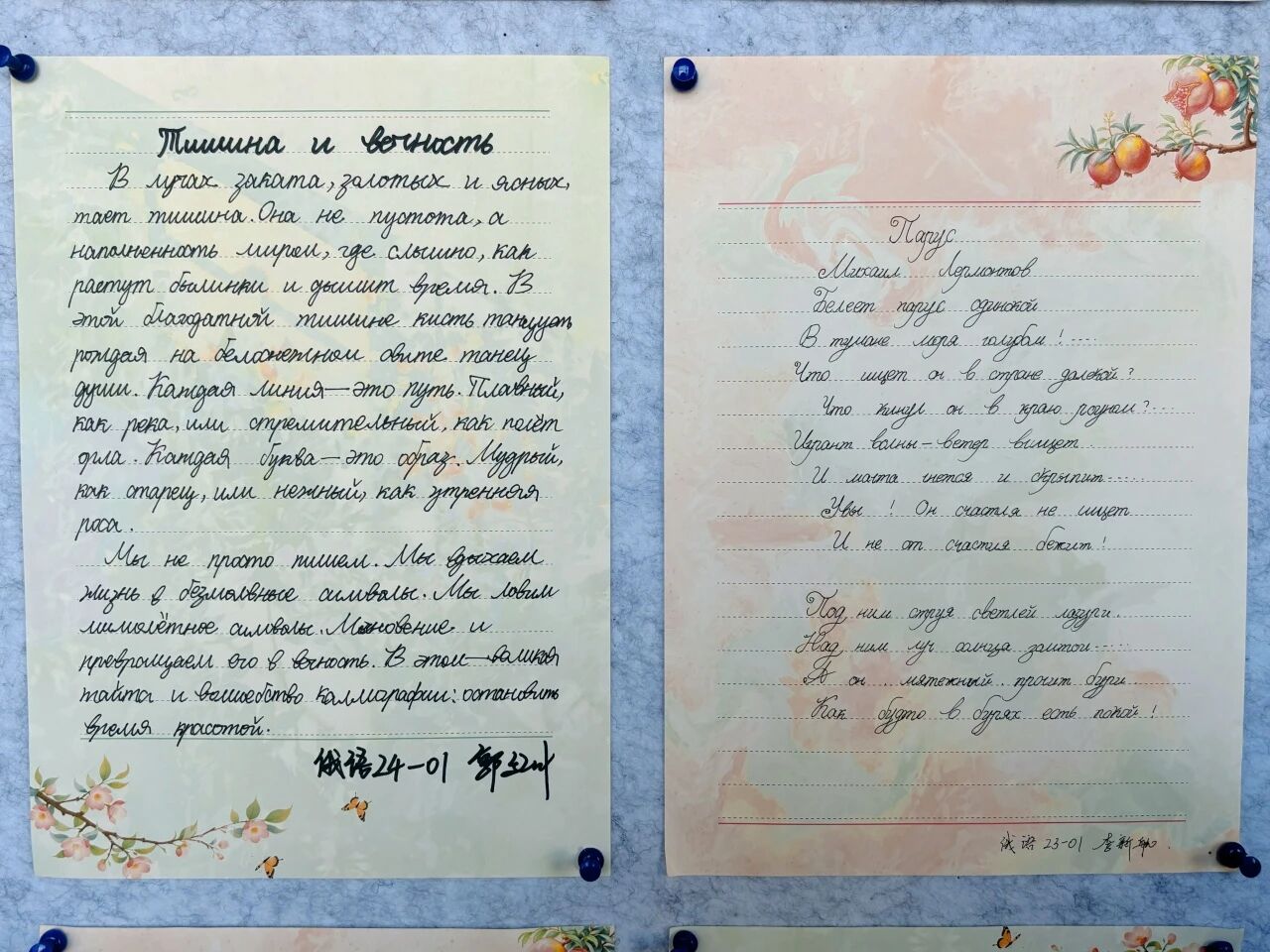 本次展览以“规范书写·精进专业·师生共进”为主题,征集到英语、俄语多语种书法作品,涵盖学生经典课文片段、专业核心词汇、励志名言书写,以及教师精心创作的外文名篇、教学感悟等内容。师生作品字迹工整、风格鲜明,既展现了学生扎实的外文书写功底与严谨学习态度,也体现了教师深厚的专业素养与育人情怀。