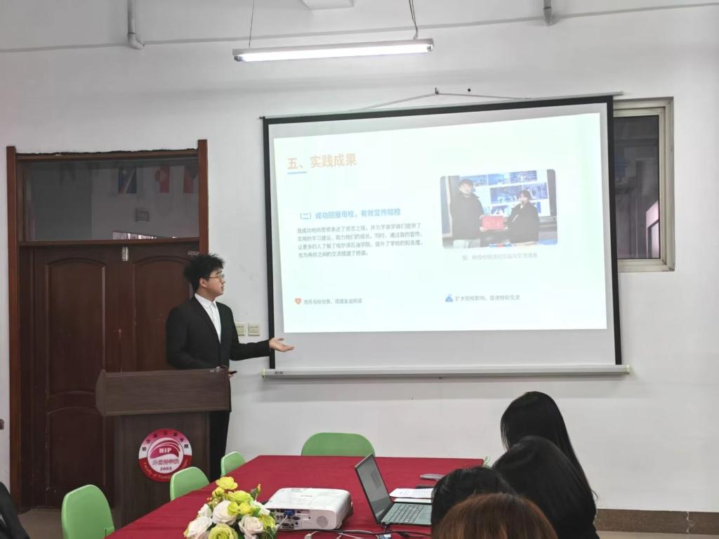 会上,各个代表依次上台,借助PPT、图文展板等形式,生动展示寒假社会实践历程与成果。汇报内容涵盖语言服务、回访母校、志愿服务等多个领域,同学们立足外语专业特色,分享了社区服务、就业实践、社会调研及返母校宣讲等实践活动中的经历与感悟,充分展现了外院学子知行合一、学以致用的良好风貌。