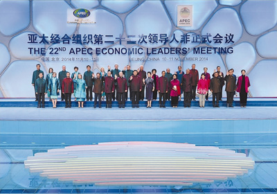习近平和彭丽媛在入口迎候,与贵宾一一握手,互致问候。各成员经济体领导人、代表在“APEC未来之舟”帆叶签名。习近平和彭丽媛与各成员经济体领导人、代表及配偶集体合影。他们身着为本次会议专门设计制作的中国式服装,既充满中国传统元素,又体现现代气息,记录下这难忘的历史时刻。碧水澄澈,彩标盈动,各美其美,和而不同,表达上善若水、和衷共济的期盼。