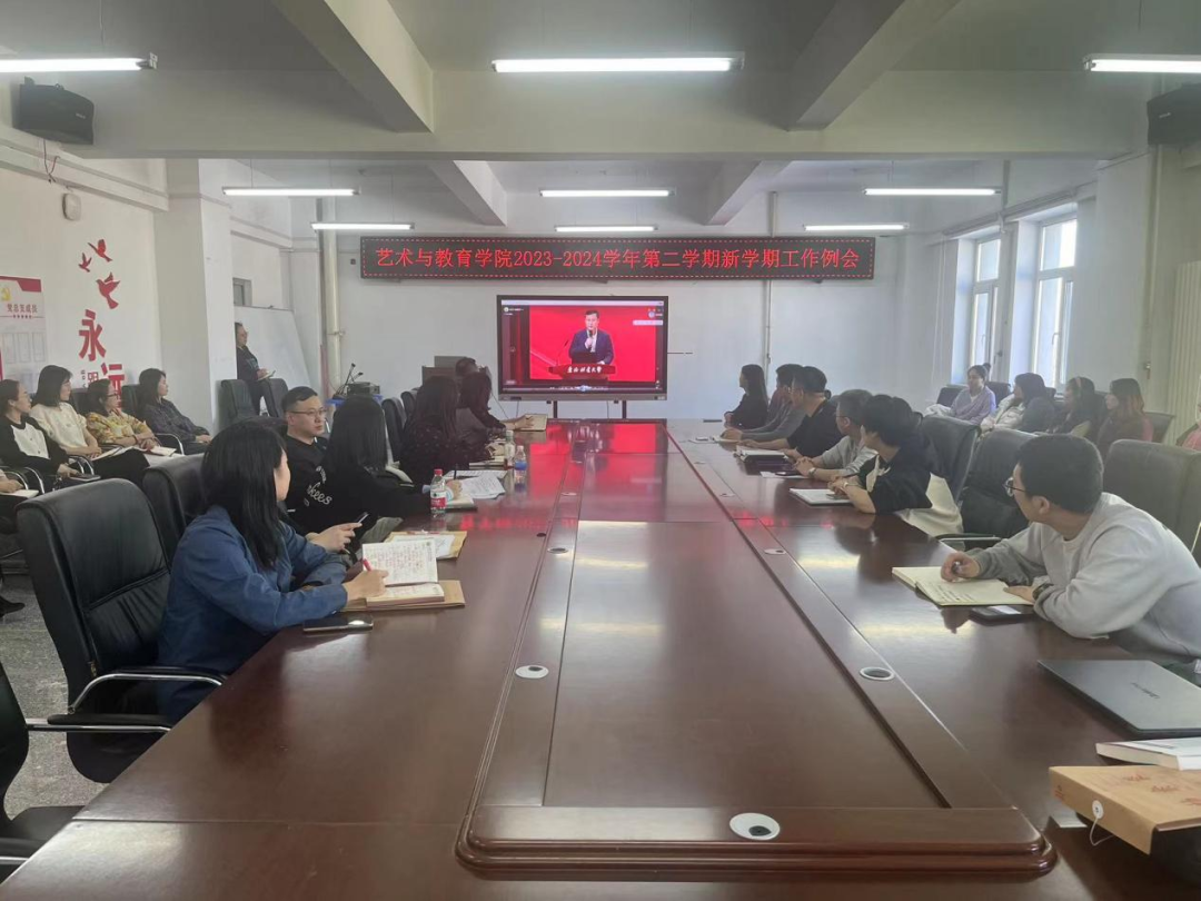 3月1日,艺术与教育学院在艺术楼415会议室召开全院新学期学院工作会议。党总支书记刘强、副院长乜艳华、王原、刘锡洋、副书记王昱及全体教职工参加会议。院长王伟建线上参会并发表讲话。