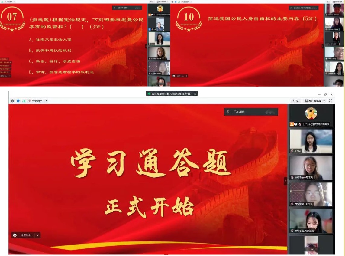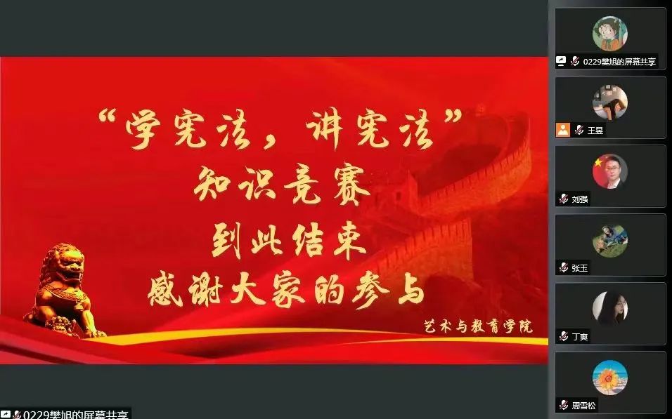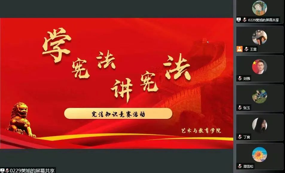 为深入学习习近平总书记法治思想,弘扬宪法精神,普及法律知识,推动我院学生宪法学习宣传教育走深走实。根据《欧博abg游戏登录入口关于组织开展第七届全校学生“学宪法,讲宪法”活动的通知》的相关要求,艺术与教育学院于2022年7月18日在腾讯会议开展了“学宪法,讲宪法”知识竞赛活动。艺术与教育学院党总支书记刘强、党总支副书记周雪松、学团办公室主任王昱以及132名学生代表参加了此次活动。学生会工作人员王文静担任本次活动主持人。