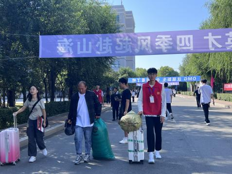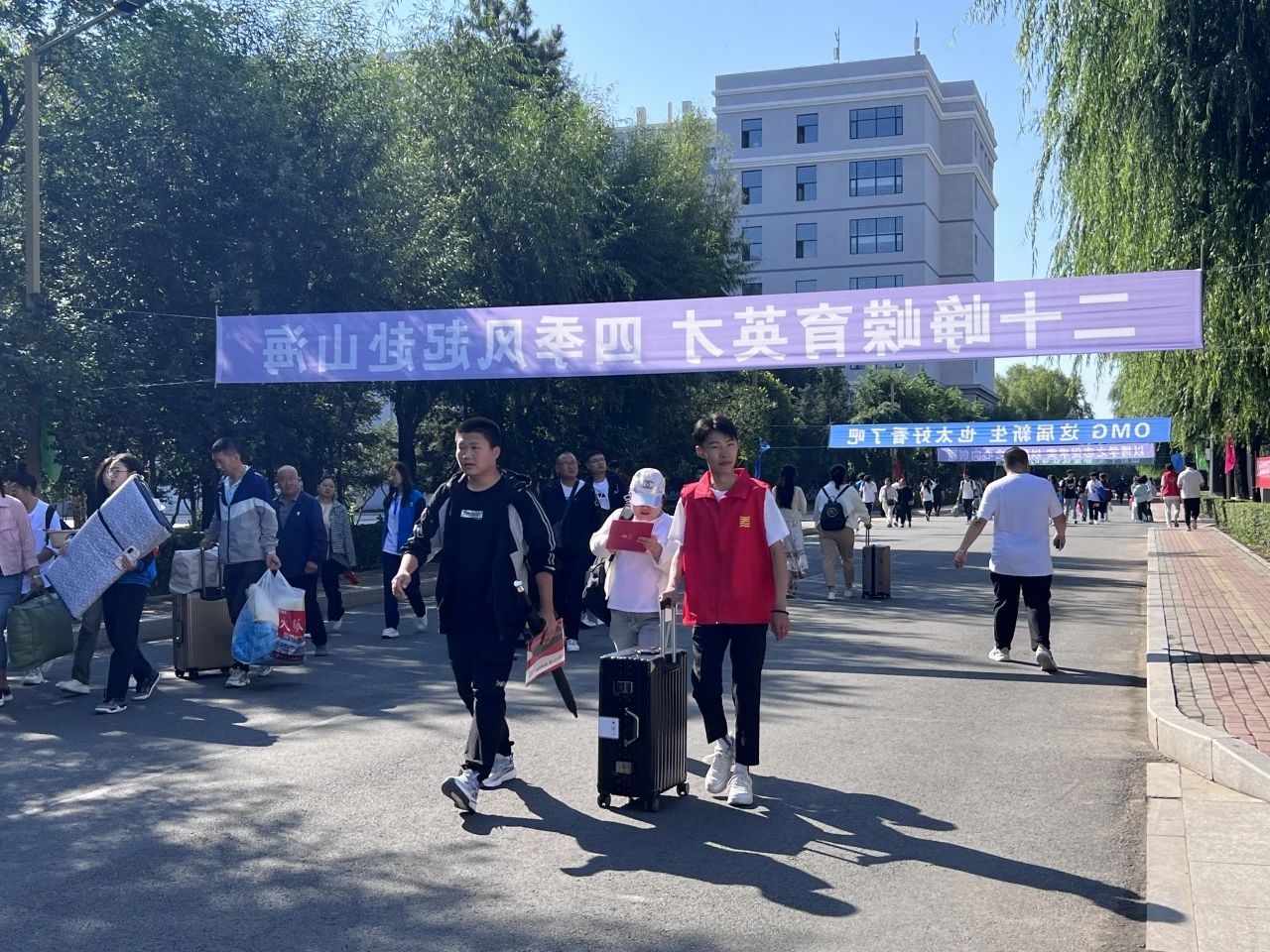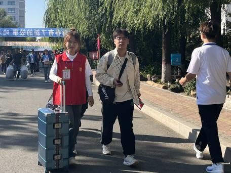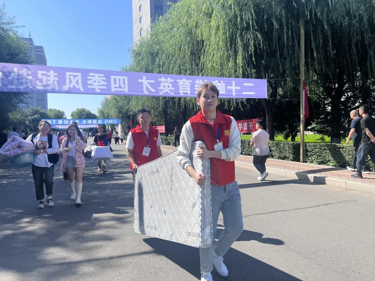 艳阳高照、接过新囊,一件接一件、有序高效穿梭与宿舍楼之间,快速引导致对应楼层成为校园里一道靓丽的风景线。