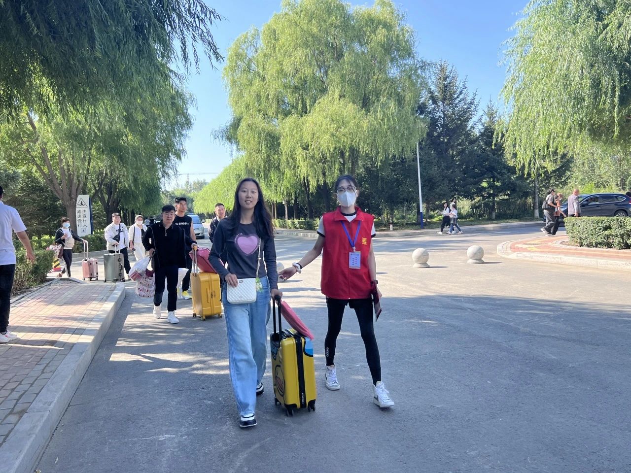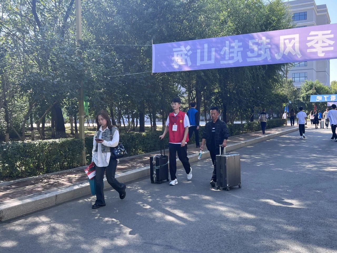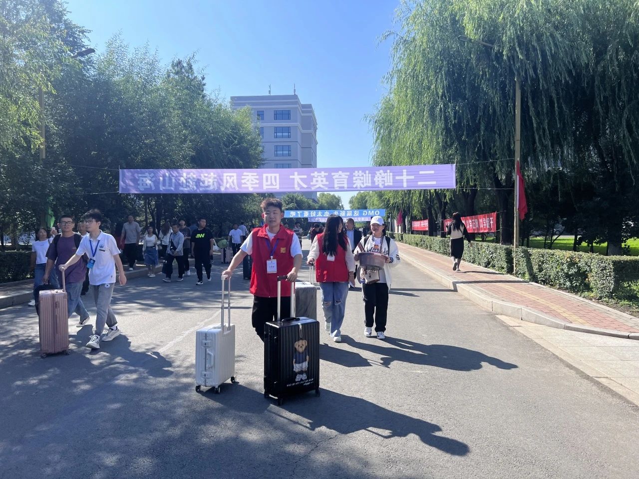 艳阳高照、接过新囊,一件接一件、有序高效穿梭与宿舍楼之间,快速引导致对应楼层成为校园里一道靓丽的风景线。