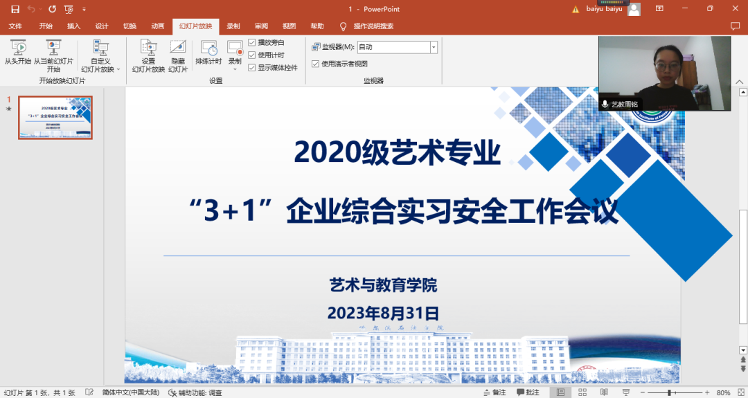 2023年8月30日及8月31日,艺术与教育学院采用腾讯会议的方式,召开了2020级学生“3+1”企业综合实习安全教育主题班会,会议由2020级辅导员郐滨、周铭主持,2020级全体同学参加。