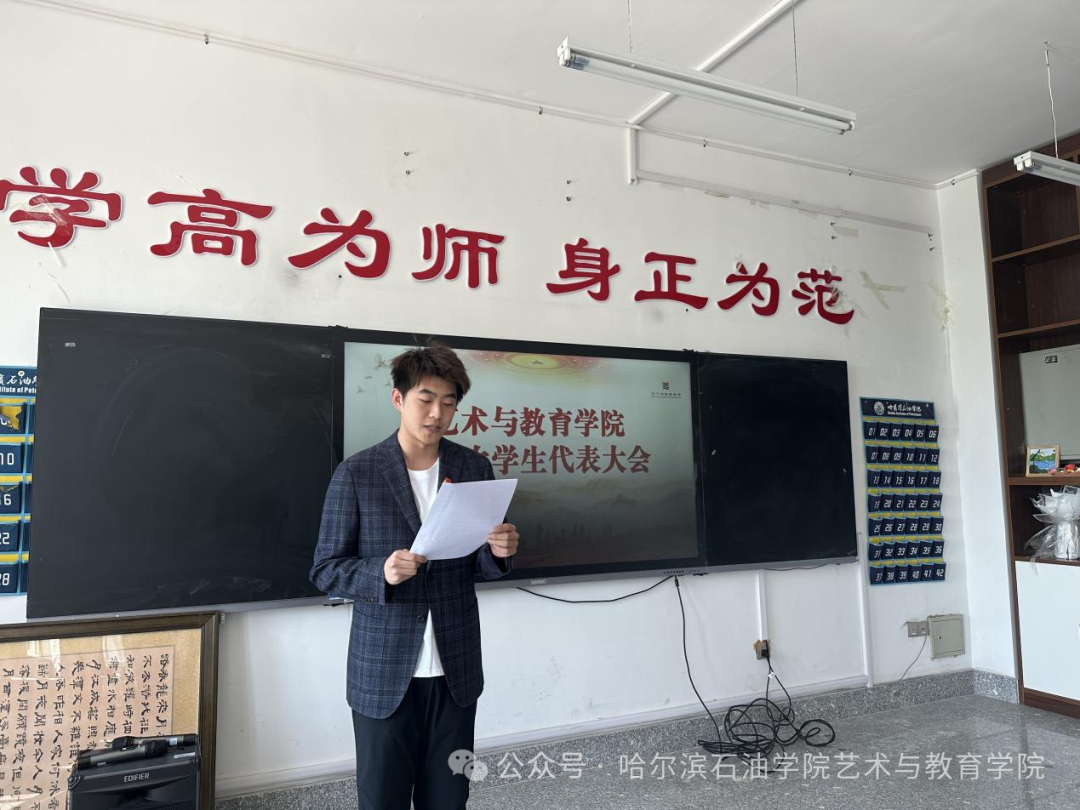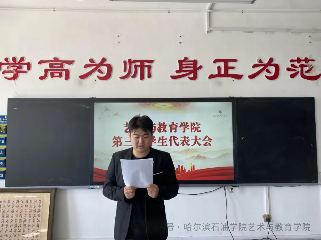 执行主席陈浩然同学向会议做《艺术与教育学院第二届委员会工作报告》。他全面阐述了上届学生联合会的工作范围、成果以及表现的不足,并表达了对学生联合会未来进步的殷切期望。陈浩然同学的陈述使参会代表们对上届学生联合会的工作具备了更深入的认识,同时也为新一届学生联合会的工作确立了前行的指向。