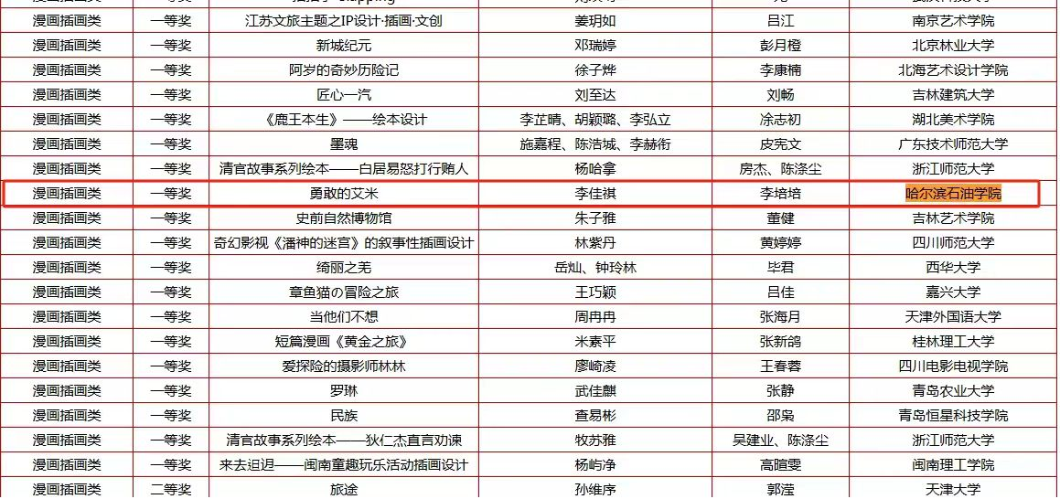 作为入选教育部中国高等教育学会发布的《全国普通高校学科竞赛排行榜》赛事,我院非常重视好创意大赛的筹备工作,从年初开始组织师生进行针对性准备。同时欧博官网作为今年的主要承办单位也用优质的服务支持大赛更好地为龙江设计类作品推优出新。入围国赛的所有作品均为省赛专家多轮次遴选推荐而成,由此可见竞争非常激烈。本届国赛获奖作品分别是动画专业教师李培培指导的漫画作品《勇敢的艾米》荣获大赛漫画插画类一等奖;广播电视编导专业教师王原、花瑞洁分别指导的交通艺术设计类作品《落日余晖中的城市动脉》、短视频类作品《风起时》获得三等奖;动画专业教师李莹指导的作品《衍化》获得漫画插画类三等奖;学前教育专业教师刘雪与动画专业教师李懿人联合指导作品《筑梦冰城,一起向未来》获得视觉传达类三等奖;数字媒体艺术专业教师张弛指导的作品《铜人旁的岁月凝思》获得数字摄影类三等奖。