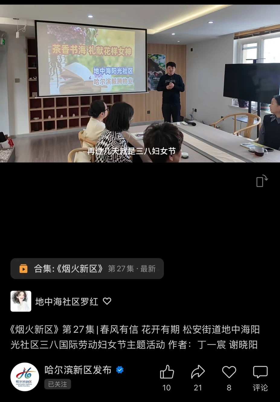 活动当天,志愿者们身着整齐服装,热情满满地忙碌起来。在茶香四溢的活动区,志愿者们精心准备茶具,为每一位前来的女性居民沏上香气扑鼻的香茗,耐心讲解各类茶叶知识,分享泡茶技巧,让大家在茶香中放松身心。而在另一侧的书海天地,志愿者们精心挑选了涵盖文学、生活、励志等多领域的书籍,邀请居民们围坐一起,开启读书分享会。丁一宸、谢晓阳两位志愿者还发挥自身的专业特长,把此次活动的美好瞬间制作成视频,为地中海阳光社区领导、女性居民及此次活动留下了美好的回忆。志愿者们所制作的视频被哈尔滨新区微信公众号采纳并发布。