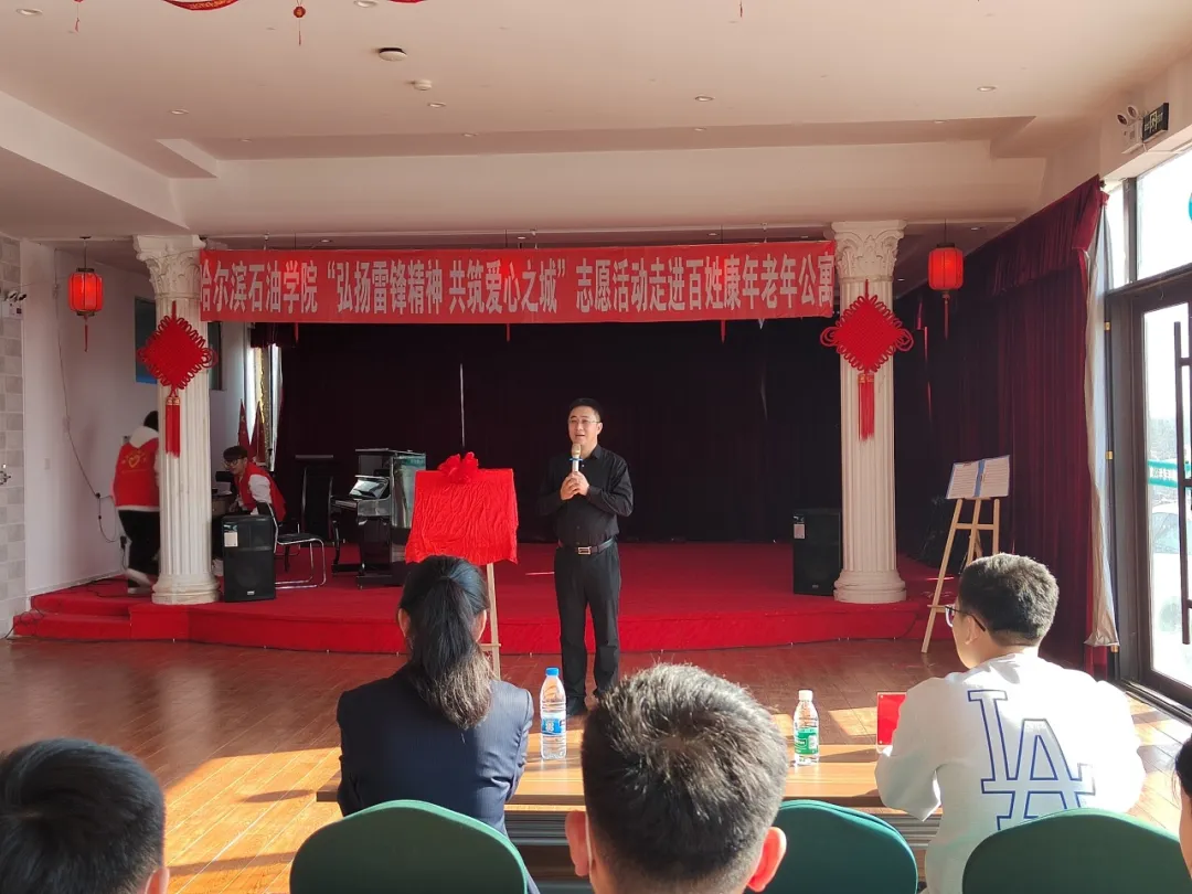 授牌仪式上,百姓康年老年公寓副院长张丽波向代表参加仪式的学院领导和青年志愿者们详细地介绍了青年志愿服务基地的基本情况,并对下一阶段志愿服务工作的开展思路作了分享。她表示会努力为我院开展志愿服务活动提供相应的支持和帮助。随后,艺术与教育学院党总支书记刘强发言,首先,他代表艺术与教育学院对百姓康年老年公寓对我院青年志愿服务活动的大力支持和帮助表示由衷地感谢,并强调了实践基地是雷锋精神的传递与志愿服务精神的延续,也是我院学子们深入了解社会、融入社会、服务社会、奉献社会的平台,希望同学们依托于基地,在这里为老人们提供细致入微的志愿服务,充分地展现新时代青年的良好风貌。最后,我院青年志愿者协会负责人张月对百姓康年老年公寓全体工作人员表达感谢,并表示会不断地用实际行动诠释志愿服务精神,传递乐于奉献的美好品质,续写新时代雷锋故事的崭新篇章。挂牌仪式结束后,志愿者们为老人们带来了精彩的文艺演出同他们一起度过了温馨快乐的时光。