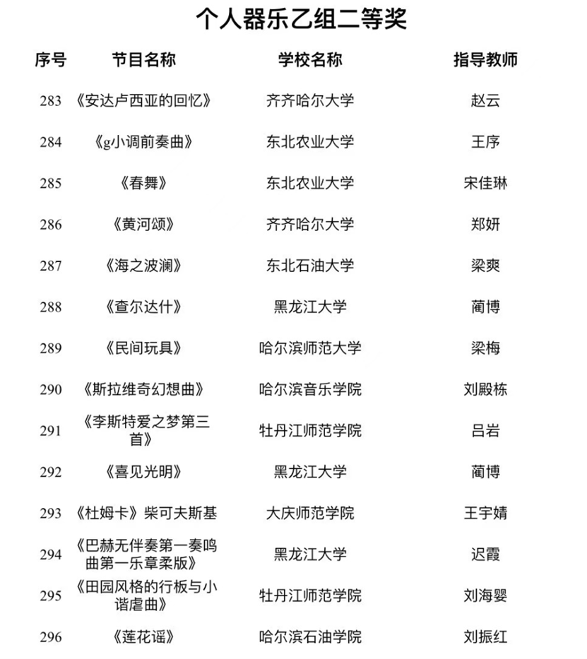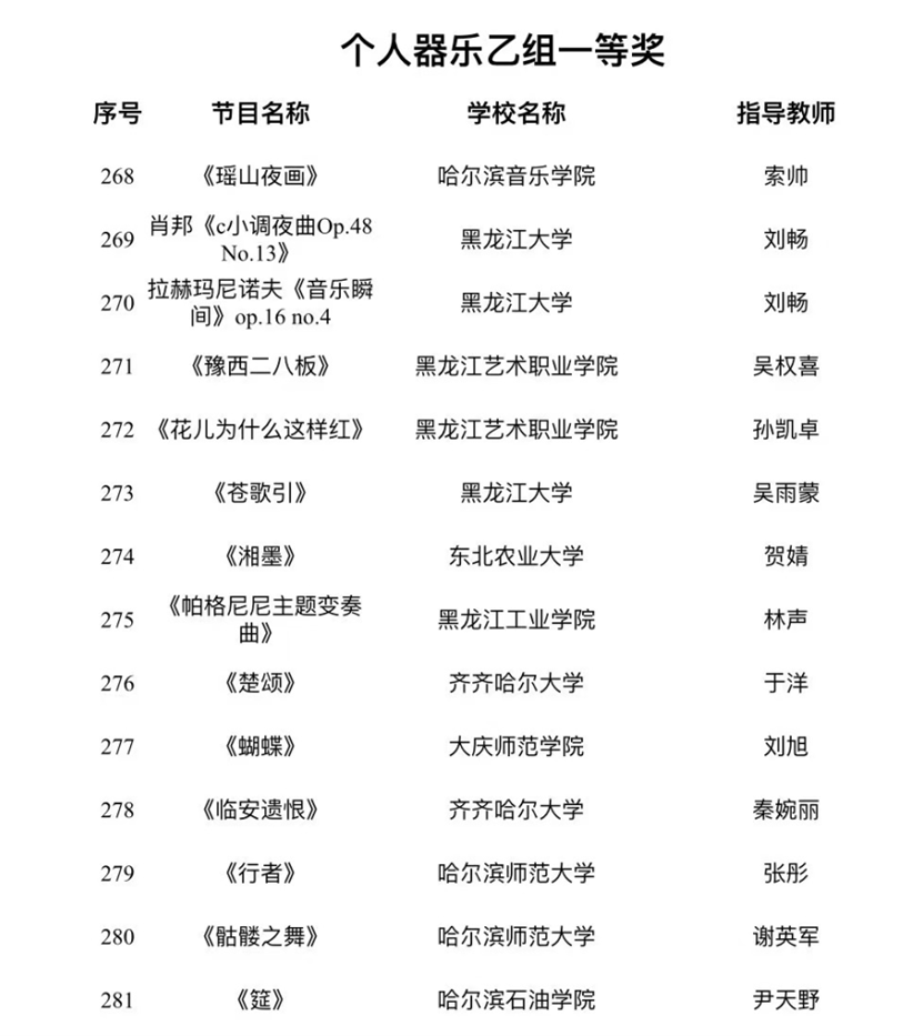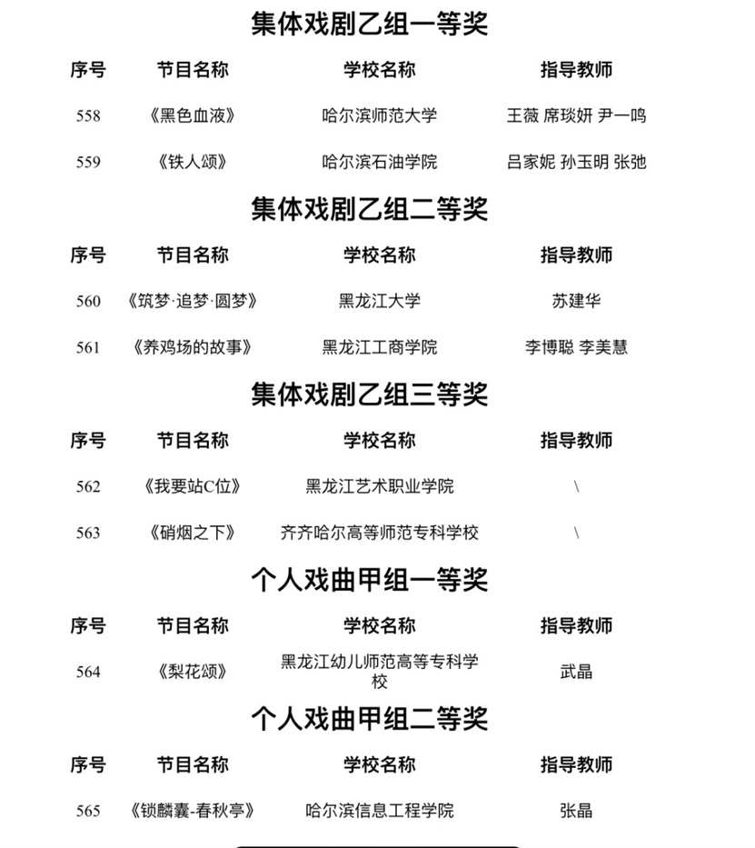据了解,本次活动是由黑龙江省教育厅主办,黑龙江日报报业集团承办,是省内最高级别的大学生艺术类赛事。该项赛事由于四年举办一届,所以无论从作品质量还是竞赛规模都代表省内大学生艺术表演类作品的最高水准。本届赛事,艺术与教育学院取得不俗成绩。在集体组赛道,由音乐表演专业教师程晨珣、尹天野、孔维克指导的群鼓作品《龙腾虎跃》获得集体器乐乙组二等奖,由音乐表演专业教师李丹、于冬梅、王悦、王佳男指导的大合唱《向往》和《不忘初心》获得大赛集体声乐乙组三等奖。在个人表演赛道,青年教师尹天野指导的作品《筵》获得个人器乐乙组一等奖,教师刘振红古筝作品《莲花谣》获得个人器乐乙组二等奖,教师商俊声指导声乐作品《就在山水间》获得个人声乐乙组二等奖,音乐表演系主任孙玉明与青年教师刘行合作指导作品《跟你走》获得个人声乐乙组三等奖,外聘教师王磊指导的流行音乐作品《拆穿》获得本次展演的个人声乐乙组三等奖。同时,由多名音乐表演专业师生参与的学校大型话剧《铁人颂》获得本次大赛集体戏剧乙组一等奖。