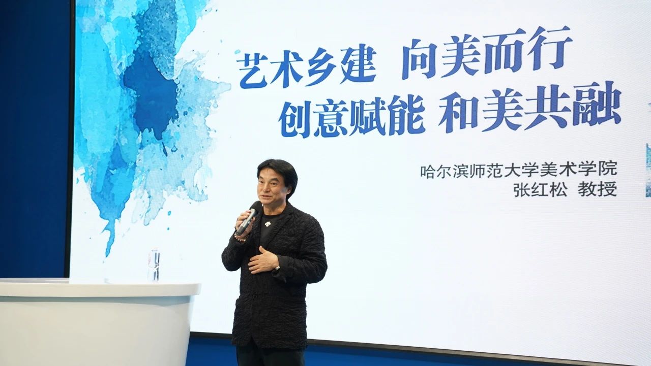 张红松教授以“艺术乡建”为核心,结合自身的学术积淀与实践经验,从乡村美学的重构、创意设计赋能产业升级、艺术教育与乡村振兴融合等维度展开论述。他通过“中华粮仓”国庆70周年黑龙江彩车设计、乡村公共空间改造案例等国家级项目,阐释了艺术在活化乡土文化、提升城乡品质中的独特价值,强调“以美为媒,让艺术成为连接城乡共融的纽带”。现场,张教授还分享了其赴世界各地的学术交流成果,为乡村艺术建设提供了国际化视野与本土化路径。