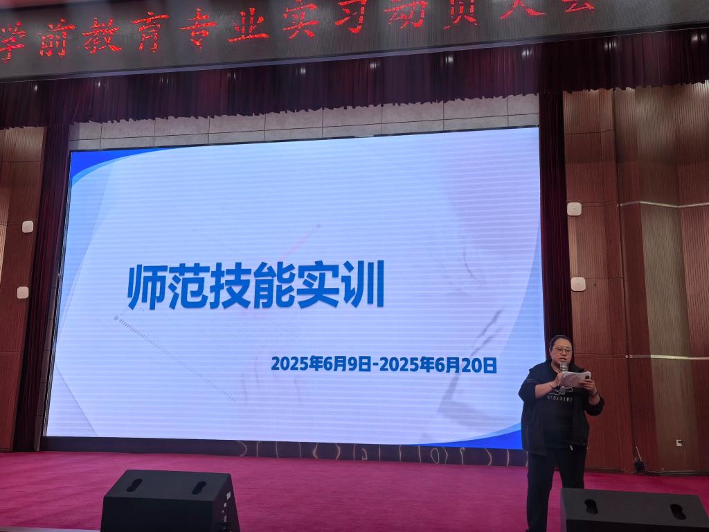 在高等教育深化改革的当下,聚焦学前教育人才培养,塑造兼具深厚学术底蕴与灵动实践智慧的专业人才,成为行业发展的需求。艺术与教育学院学前教育专业于2025年6月3日下午,在图书馆报告厅开展“2024-2025-2学年实习动员大会”。此次会议由实训中心主任孙慧芯主持,学前教育专业全体教师与2022级学生积极响应,聚焦“产教融合、协同育人”的教育理念,构建理论与实践深度融合的育人新格局。