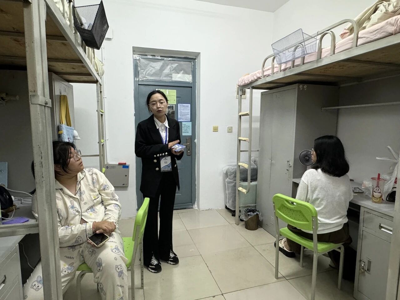 学院领导逐一走访各新生寝室,与同学们亲切交谈,细致询问他们的生活适应情况、入学初步体验以及对专业学习的初步认识。王伟建院长在交流中强调,学院始终是同学们的坚实后盾,希望大家尽快适应大学节奏,勇敢面对挑战,科学规划学业与职业方向。各位领导也从专业发展、校园资源、用电安全等方面给予耐心指导和解答,帮助新生更好更快地融入大学生活。