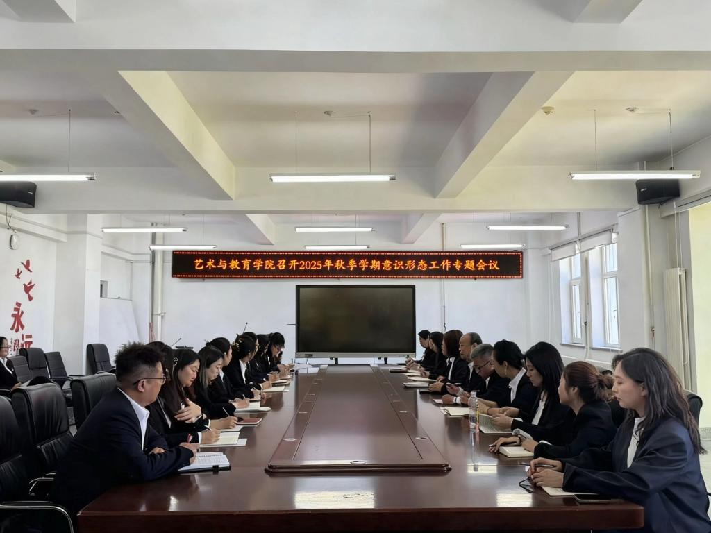 为进一步加强和改进新形势下学院意识形态安全稳定工作,筑牢思想根基,夯实安全防线,确保新学期各项工作平稳有序开展,艺术与教育学院于9月16日在会议室召开2025年第五次党组织理论学习中心组专题学习会,深入学习习近平总书记关于意识形态工作的重要论述学院领导班子、各系主任以及教师党员参加会议,会议由学院党总支书记徐宏莉主持。