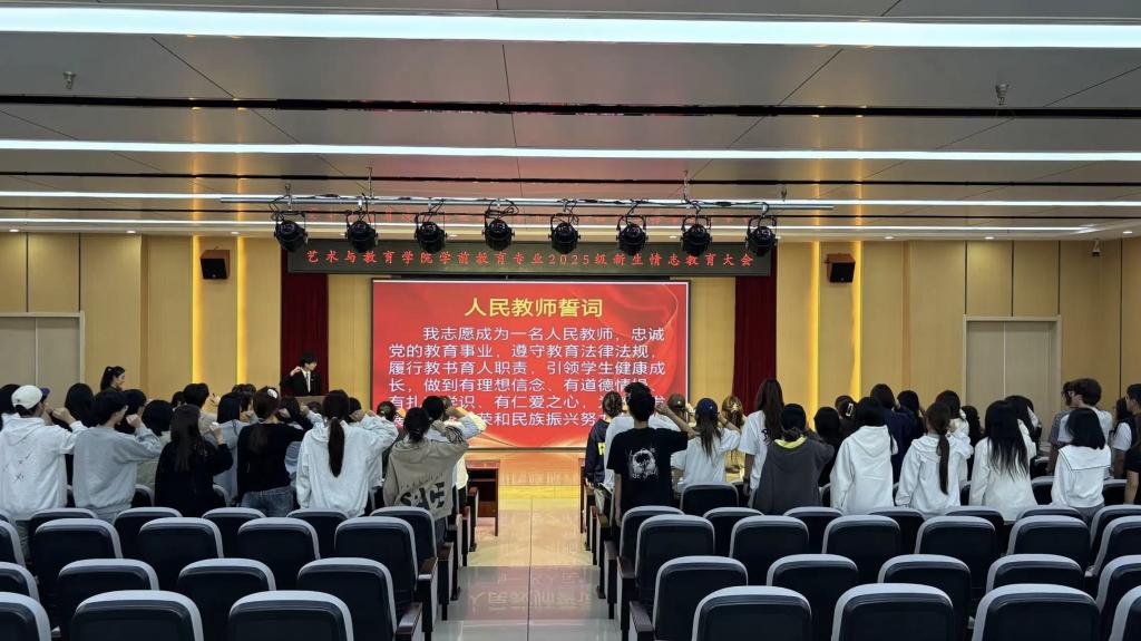 大会的最后, 在学生会主席的带领下,全体2025级学前教育专业新生肃立,举起右拳,用铿锵有力的声音许下了成为一名光荣人民教师的郑重承诺。坚定的誓言回荡在教室,不仅将整场大会推向高潮,更将“学高为师,身正为范”的信念深深烙印在每一位新生的心中。