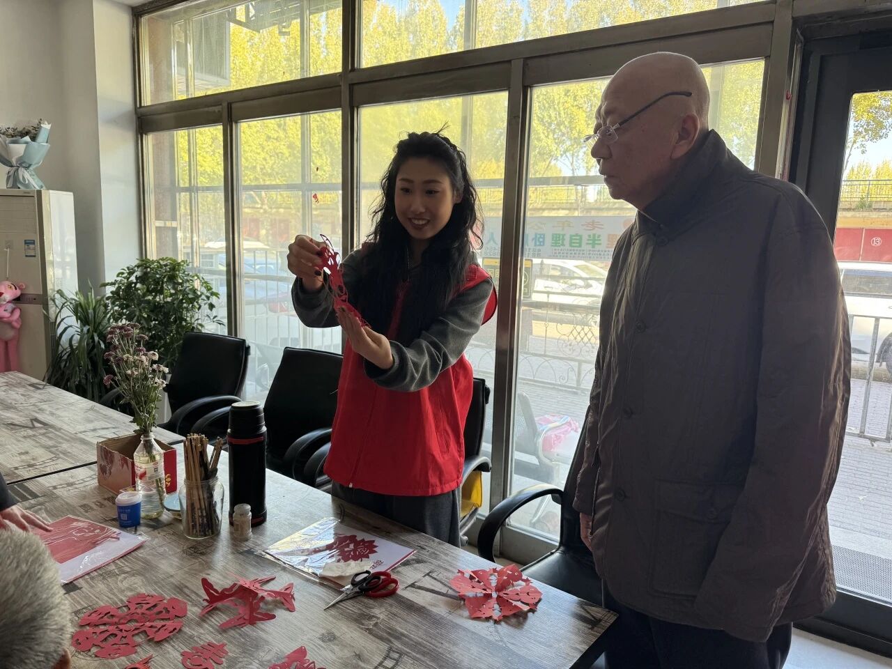 几位爷爷遛弯回来后志愿者们主动地和老人打招呼唠家常,志愿者们对老人进行慰问,耐心地教老人们剪窗花,手把手的指导、温柔的鼓励,让老人们脸上洋溢着幸福的笑容。倾听他们讲述过去的故事,用陪伴温暖着老人们的心灵。