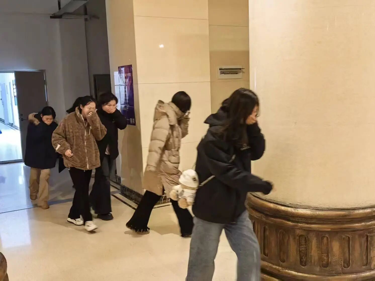 在消防演练环节,模拟火灾警报声骤然响起,同学们在老师和工作人员的有序引导下,迅速做出反应,用手捂住口鼻,保持弯腰低姿,沿着预设疏散路线快速撤离。各楼层疏散引导员坚守岗位,沉着指挥,确保每一位同学安全抵达指定集结点。短短数分钟内,全体同学成功撤离至安全区域。整个疏散过程快速高效,充分体现出同学们良好的消防安全意识和应急反应能力。