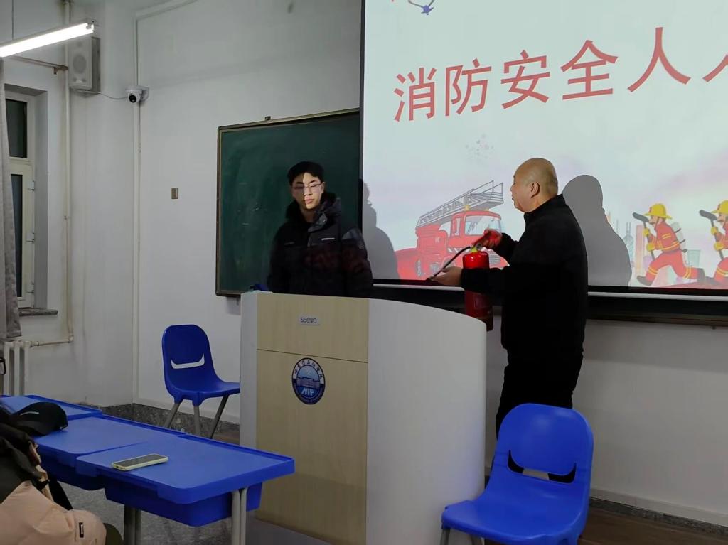 王炳旭老师运用理论讲解与实操演练相结合的模式,为同学们普及消防安全基本常识、火灾防控举措及火灾应急处理流程。通过播放典型火灾案例视频,结合学生日常学习生活场景,详细阐释火灾基本常识、常见火灾类型、火灾报警要点、疏散逃生技巧以及灭火器规范使用方法等内容。辅导员周铭则针对艺术楼各功能室的安全设备操作方法进行细致讲解,同学们专注聆听,积极提问互动,现场学习氛围热烈。
