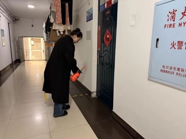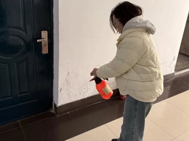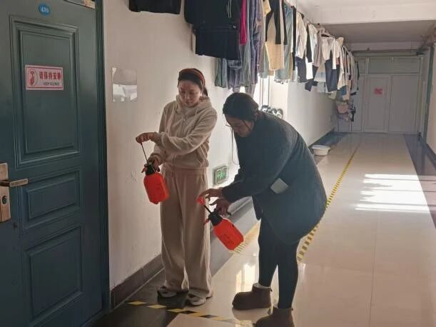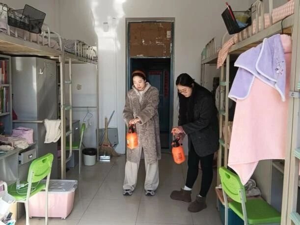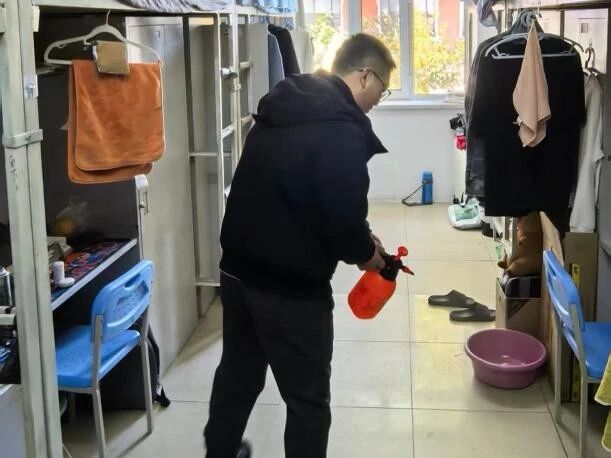 辅导员们对寝室、楼道、洗漱间等公共区域进行全面喷洒,确保环境消杀无死角。同时暖心叮嘱同学们“天气渐凉,适时增添衣物,做好保暖。”