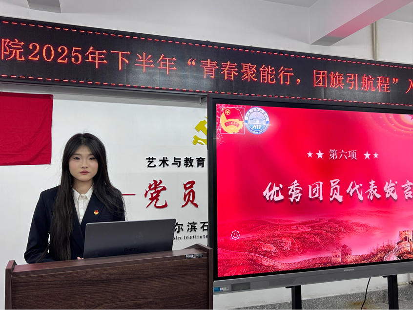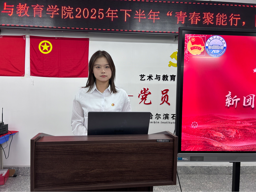 仪式在庄严的中华人民共和国国歌声中拉开帷幕,全体人员肃立致敬,浓厚的仪式感让每一位参与者深切感受到共青团组织的神圣与庄严。随后,艺术与教育学院团总支副书记郭鸿博宣读2025年下半年新发展团员名单,现场响起热烈掌声,既是对新团员过往努力的肯定,更是对他们未来青春征程的期许。
