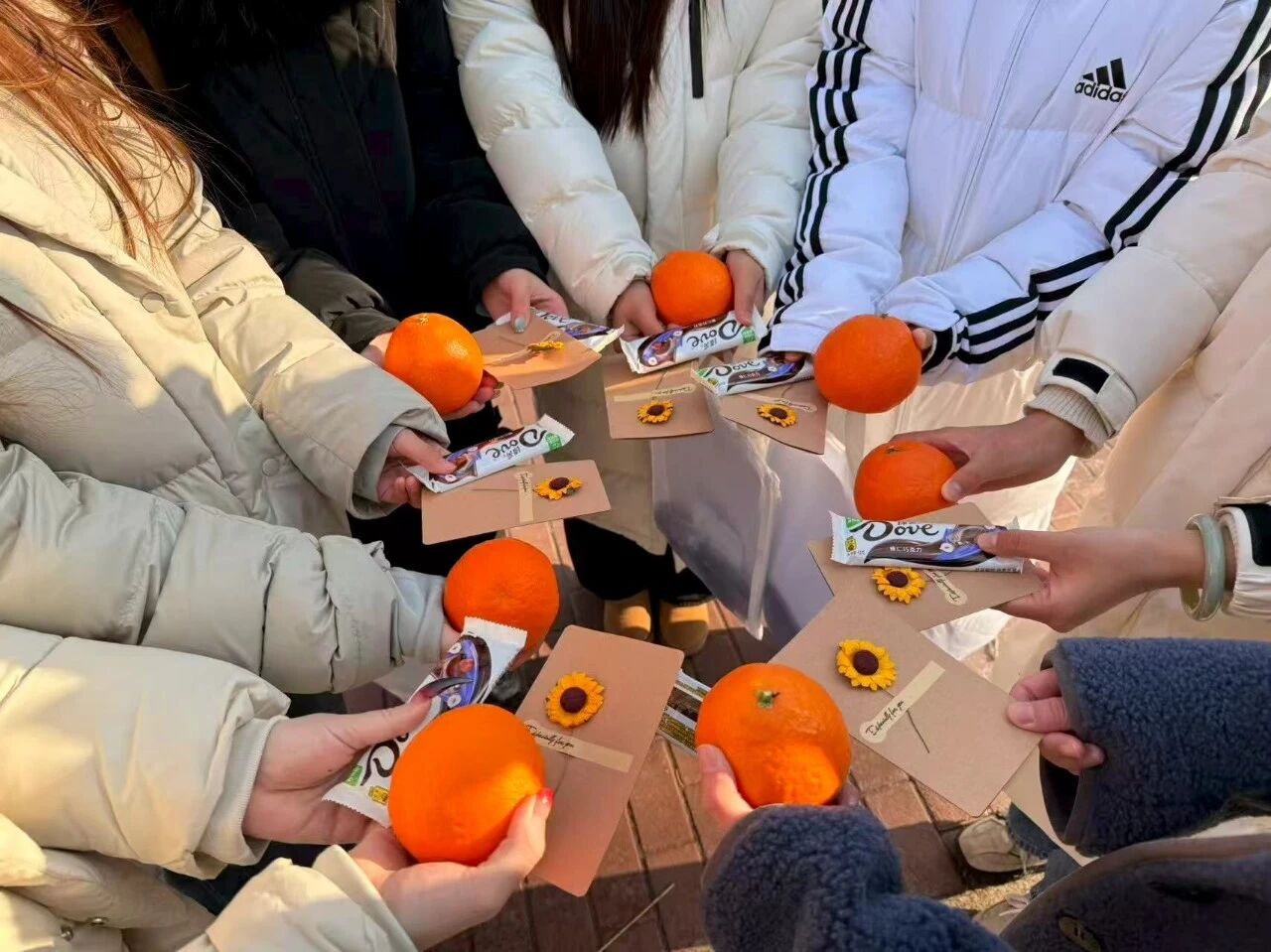 上午首场考试结束后,辅导员们早已守候在考场外,手持精心准备的“考研专属加油包”迎接学子归来。“考得怎么样?别给自己太大压力”“调整好节奏,下一科继续加油”……一句句暖心问候如春风化雨,缓解着考生们的紧张情绪。礼包内,“心想事‘橙’”的新鲜橙子寓意超常发挥、梦想成真;“巧克难题”的坚果巧克力寄托着攻克难关的期许;定制向日葵卡片上“一举夺魁”的祝福,则传递着金榜题名的真挚祝愿。辅导员们一边分发物资,一边与考生亲切交谈,针对考试焦虑、科目衔接等问题提供心理疏导,鼓励大家以平和心态迎接后续挑战。