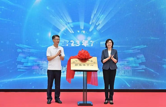 哈尔滨市委常委、宣传部长兰峰与哈尔滨广播电视台党组书记、台长朱相臣为哈尔滨广播电视台融媒体中心揭牌