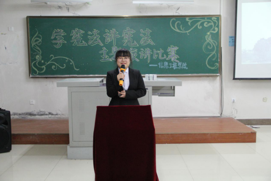 为庆祝第三个宪法日,加强大学生对宪法的认识,争做一个守法的公民。信息工程学院近日在二教401举行了以“学宪法,讲宪法”为主题的大型演讲活动。出席此次活动嘉宾的有信息工程学院党总支书记苏永彬,院辅导员张宏鹏,教学秘书文强及学生会各部部长。