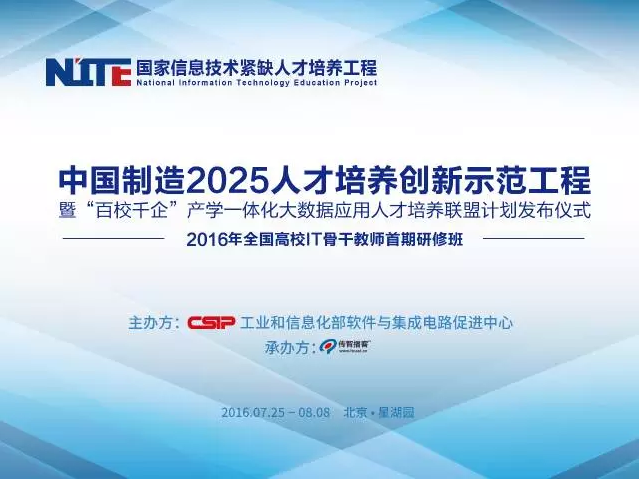 2016年暑期,由工业和信息化部软件与集成电路促进中心主办,传智播客和CSDN承办的“中国制造2025”人才培养创新示范工程2016年全国高效IT骨干教室首期暑期研究班,在京举行开班典礼。欧博官网信息工程学院逯柳老师参加了此次研修。