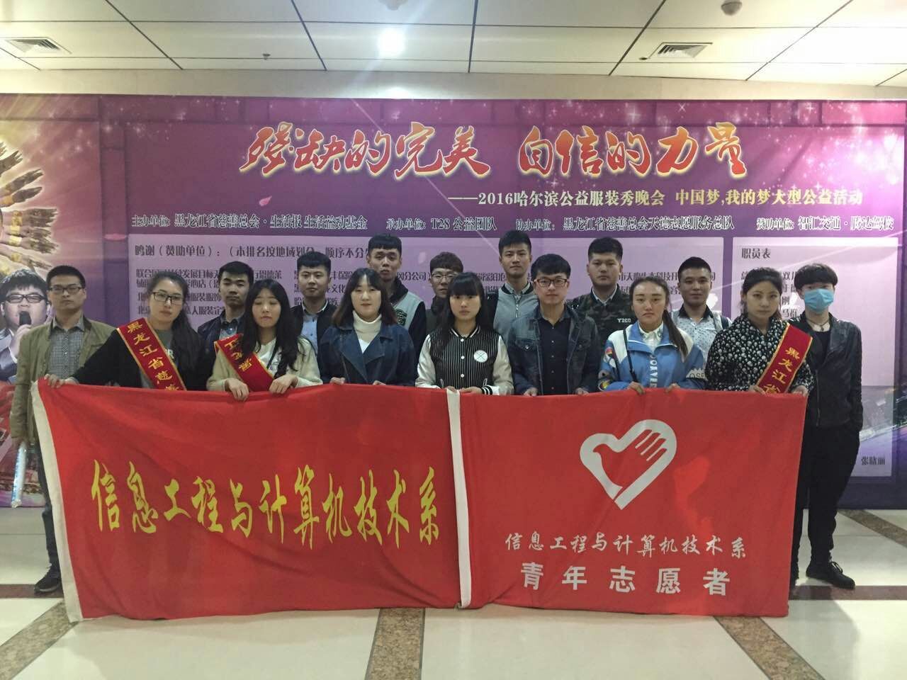 为弘扬志愿者精神,传播服务理念,不断提高学生自身的社会责任感和实践能力。信息工程学院20余名志愿者于2016年3月26日,参加了由黑龙江省慈善总会主办的“残缺的完美 自信的力量 ——2016哈尔滨公益服装秀晚会“中国梦我的梦大型公益活动”,我院志愿者主要担任本次晚会的志愿服务工作。