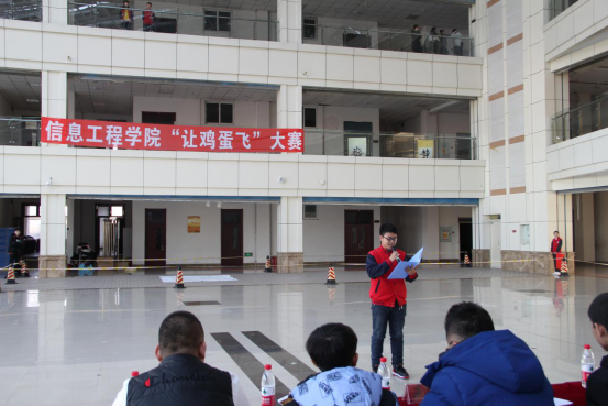 为丰富大学生课余生活,提高同学们的创新能力。信息工程学院于11月19日中午12时在主教阳光大厅成功开展“让鸡蛋飞”大赛。此次比赛邀请到的嘉宾有院辅导员黄家政及学生会主席团成员,全体18级同学观看本次大赛。本次大赛旨在培养同学们的创新精神,发掘同学们的动手实践能力。