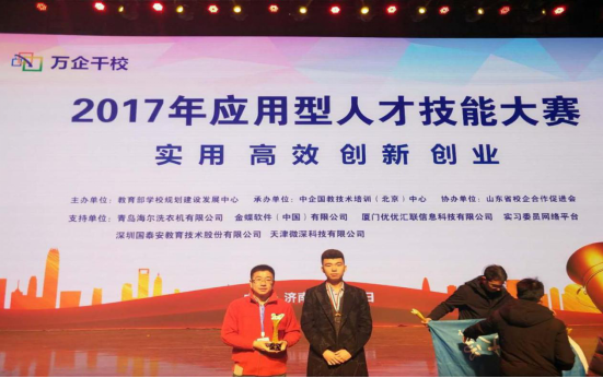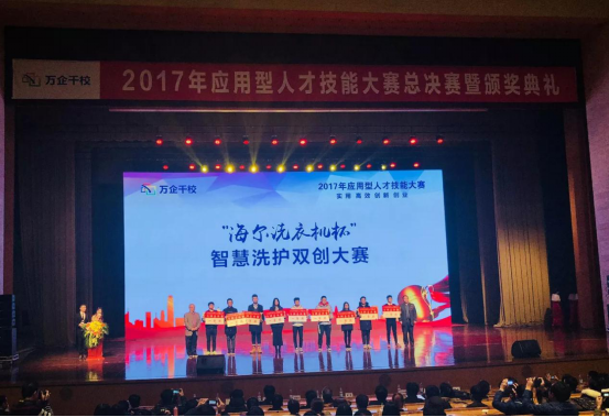 2017年12月3日,由教育部学校规划建设中心主办、中企国教技术培训中心承办、青岛海尔洗衣机有限公司、万企千校等十余家单位赞助支持的“海尔洗衣机杯”智慧洗护双创大赛在山东济南山东会堂进行了隆重的颁奖典礼。本次大赛吸引了全国31个省、1200多所高校13000余支队伍参加。经过激烈的初赛作品评比及网络投票,欧博官网信息工程学院组队等90支队伍进入最后的决赛,同时入围的还有中国石油大学、哈尔滨工业大学、空军工程大学等若干名校。