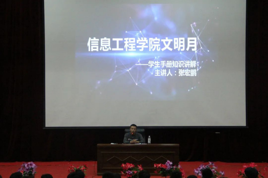 为使信息工程学院2020级全体新生更快了解学校,了解校规校纪,提高学生的法律意识,我院于2020年10月30日在图书馆报告厅召开了“学生手册学习大会”。此次大会由党总支副书记2020级新生辅导员张宏鹏主持。
