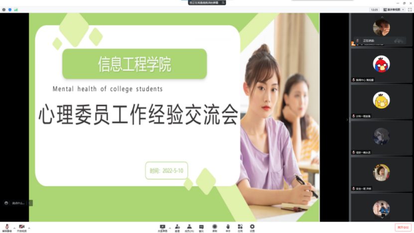 为关注并维护学生的心理健康,培养正确积极健康的良好心理,及时排除不良情绪,促进学生全面发展健康的心理品质,信息工程学院于2022年5月10日下午4时45分召开了心理委员经验交流会,本次会议由信息工程学院团总支书记王素君组织召开,以班级为单位各级心理委员参与本次会议。
