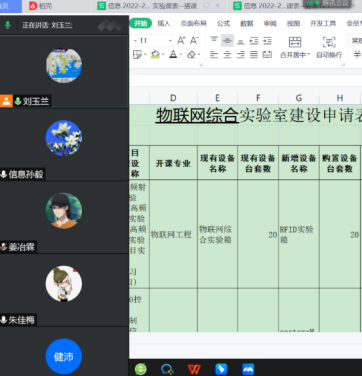 2022年物理网工程专业获批了省一流专业建设专业。为了更好的适应专业发展、符合最新版培养方案及一流专业验收,信息工程学院将申请对物联网工程专业实验室部分改造升级。本次会议刘玉兰主任汇报将要对RFID、嵌入式cotex-M及2门实训课程实验设备进行调整,提出目前实验室面积有限是否可以单独设立实训室。刘主任指出对这些设备调整的原因是基于物联网技术发展迅速、现有设备部分提供验证性实验或者需要提升设备功能等。