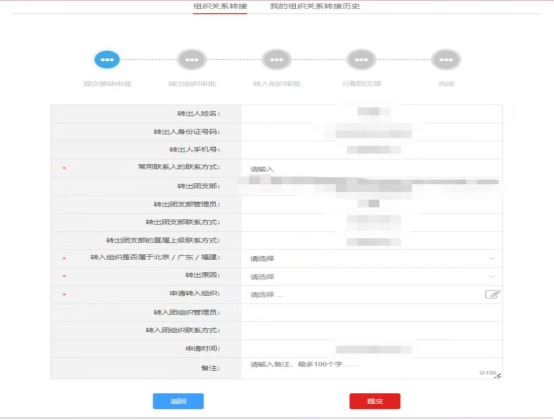 团员个人发起:团员登录系统进入个人中心,点击左侧“关系转接”菜单。按要求填写转接信息,注意转入组织填写为所在院系团委,提交即可详细流程如下: