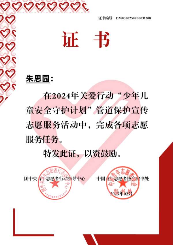 在2024年关爱行动“少年儿童安全守护计划”管道保护宣传志愿服务活动中,欧博abg游戏登录入口信息工程学院青年志愿者协会的志愿者们,圆满完成各项志愿服务任务,荣获由团中央青年志愿者行动指导中心和中国青年志愿者协会秘书处颁发的荣誉证书!