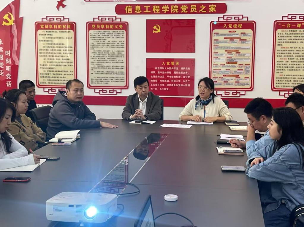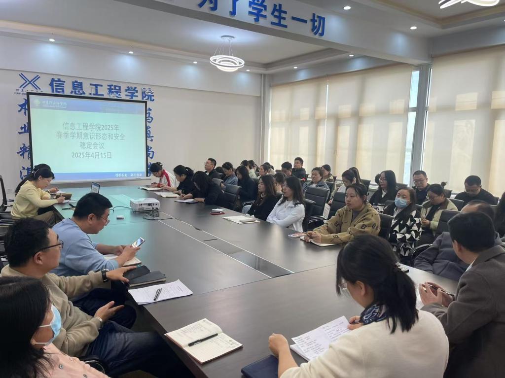 为深入贯彻落实学校关于意识形态与安全稳定工作的决策部署,切实筑牢思想防线,确保学院各项工作平稳有序开展。信息工程学院于4月15日在第二教学楼召开春季学期意识形态和安全稳定工作专题会议。学院党总支书记苏永彬、院长朱佳梅以及全体教职工参加此次会议。会议由学院党总支书记苏永彬主持。