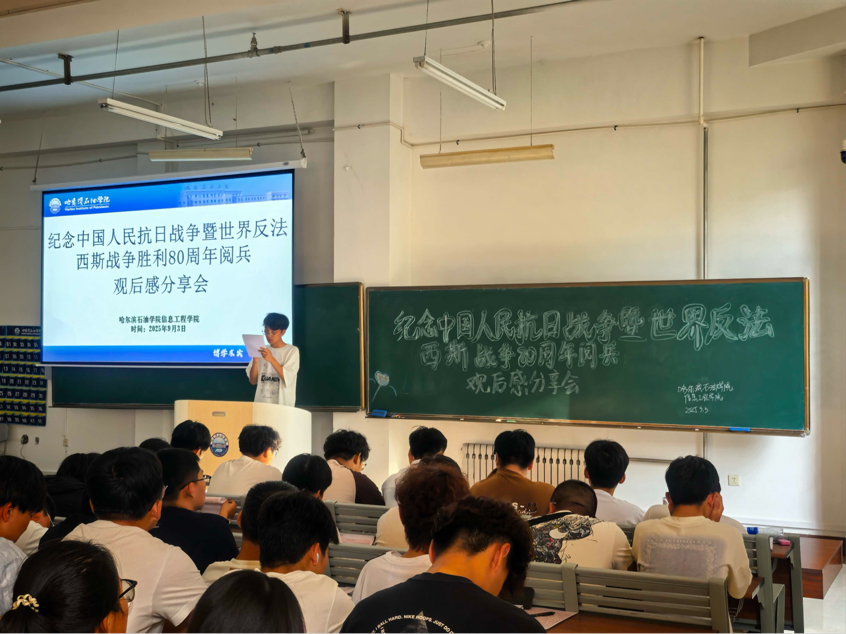 为缅怀革命先烈,传承伟大抗战精神,2025年9月3日,在庄严的阅兵仪式结束后,信息工程学院全体2025级新生在辅导员王天骥老师的组织下,于第一教学楼开展了一场庄严而热烈的阅兵观后感分享会。