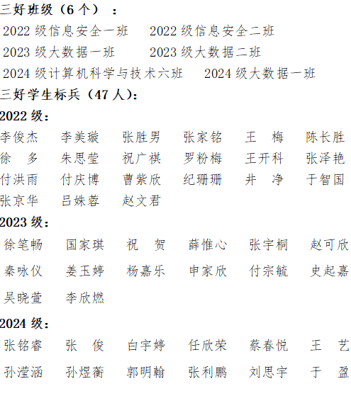 根据学校《关于开展2024-2025学年度共青团评优工作通知》和《欧博abg游戏登录入口共青团评优办法》的相关要求,本着公平、公开、公正原则,信息工程学院团总支和各年级团支部积极组织学生申报,经过个人自荐、各团支部民主推荐,学院精心组织,成立了学院评优评审工作组。评审工作组秉持着公平、公正、公开的原则,召开评审会议,对申报的集体和个人事迹、材料进行了严格审核和认真评议。按照通知规定的条件、比例和名额,经过层层筛选,最终评选先进班级6个 三好标兵47人 三好学生 82人 优秀干部标兵23人 优秀学生干部 42人 现将拟推荐名单公示如下: