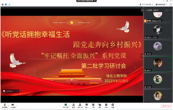 为进一步学习贯彻习近平新时代中国特色社会主义思想主题教育,提高我院全体师生党员的党性修养。8月15日晚七点,信息工程学院宋楠楠老师组织信息工程学院教师党支部22名教师党员、信息工程学院学生党支部54名学生党员召开关于《听党话拥抱幸福生活,跟党走奔向乡村振兴》等5部党课和“牢记嘱托,全面振兴”系列党课6部线上党课学习研讨会。